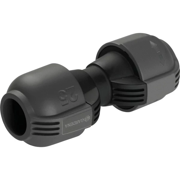 Le raccord 25 mm GARDENA, élément du système d’arrosage GARDENA, sert à allonger facilement la conduite de raccordement. La technologie de connexion simple brevetée Quick & Easy permet d’assembler et de désassembler les conduites sans outils en tournant simplement les raccords vissés de 140°.