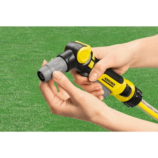 Ce n’est que Kärcher qui offre tant de confort: la poignée rotative avec gâchette verrouillable peut être pointée vers l’avant ou vers l’arrière, en permettant ainsi une opération individuelle du pistolet. En plus, le pistolet est composé d’éléments doux en plastic, qui offrent une protection supplémentaire. Grâce à la vanne de contrôle, qui peut être opérée d’une seule main, le débit d’eau peut être réglé selon la demande. Le pistolet d’arrosage Plus est équipé de 2 formes d’arrosage: le jet crayon et le jet conique creux. Ces formes peuvent être ajustées à tout moment selon les souhaits – par exemple, pour l’arrosage de fleurs et de plantes ou pour l’élimination de gros déchets des terrasses ou des meubles de jardin. D’ailleurs: les pistolets d’arrosage de Kärcher sont compatibles avec tous les systèmes click disponibles et peuvent être raccordées sans problèmes à votre tuyau d’arrosage.